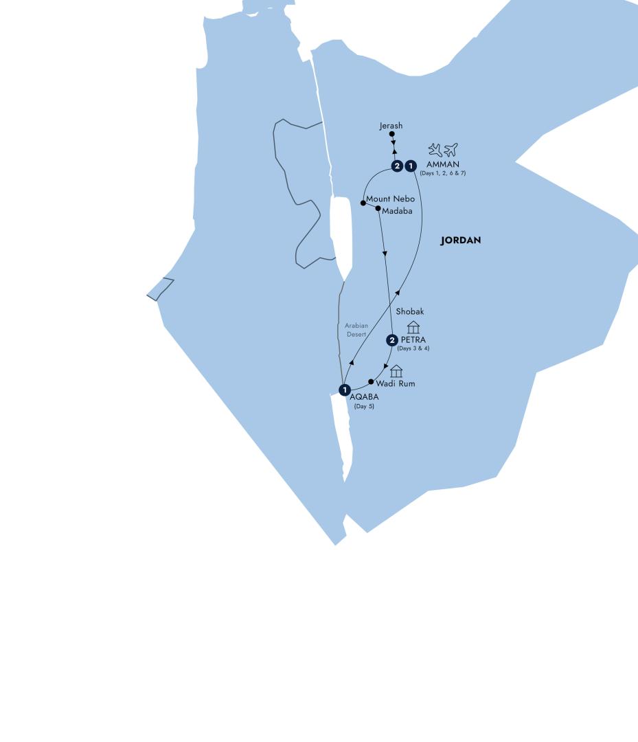 After breakfast, you are transferred to Amman Airport for your onward flight.