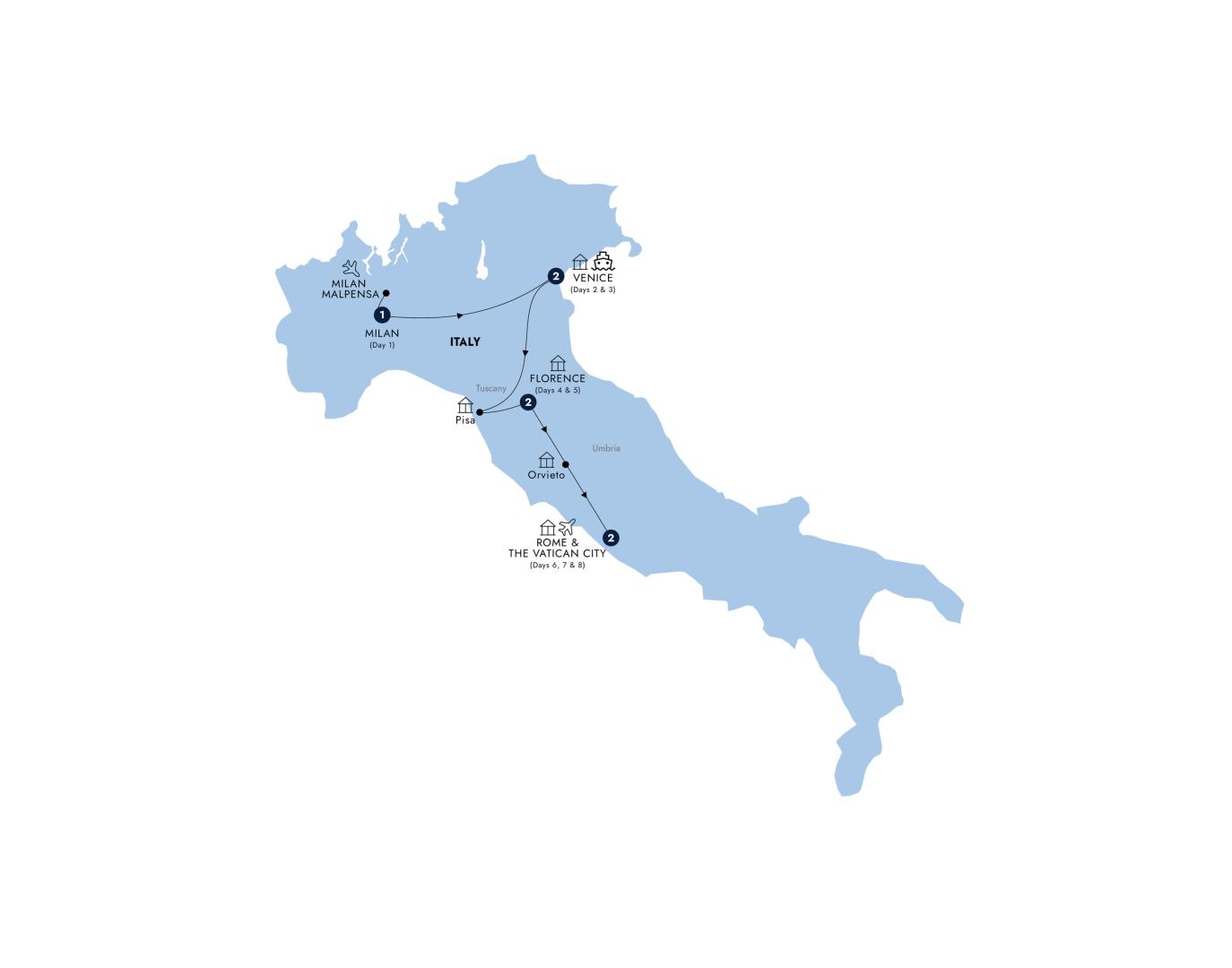 Bid farewell to the glories of Italy, savoring the memories of its enchanting cities, historic landmarks and stunning landscapes. Italy's unique allure will linger in your heart long after you leave.