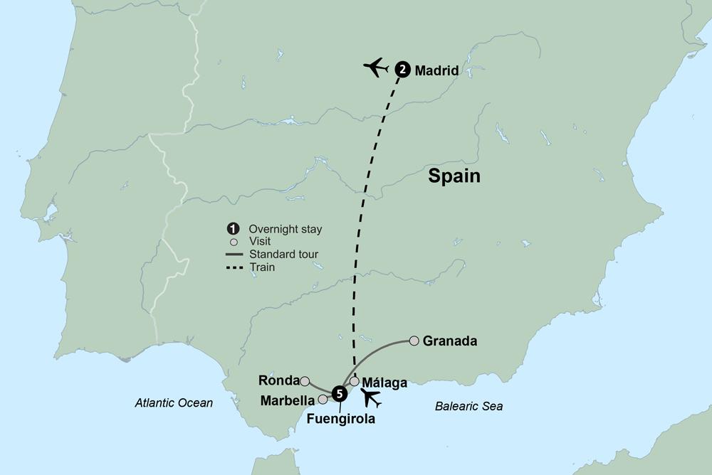 Get ready for a true taste of southern Spain, from the sparkling blue waters of Costa del Sol to the chic avenues of Madrid. Your tour begins with an overnight flight.